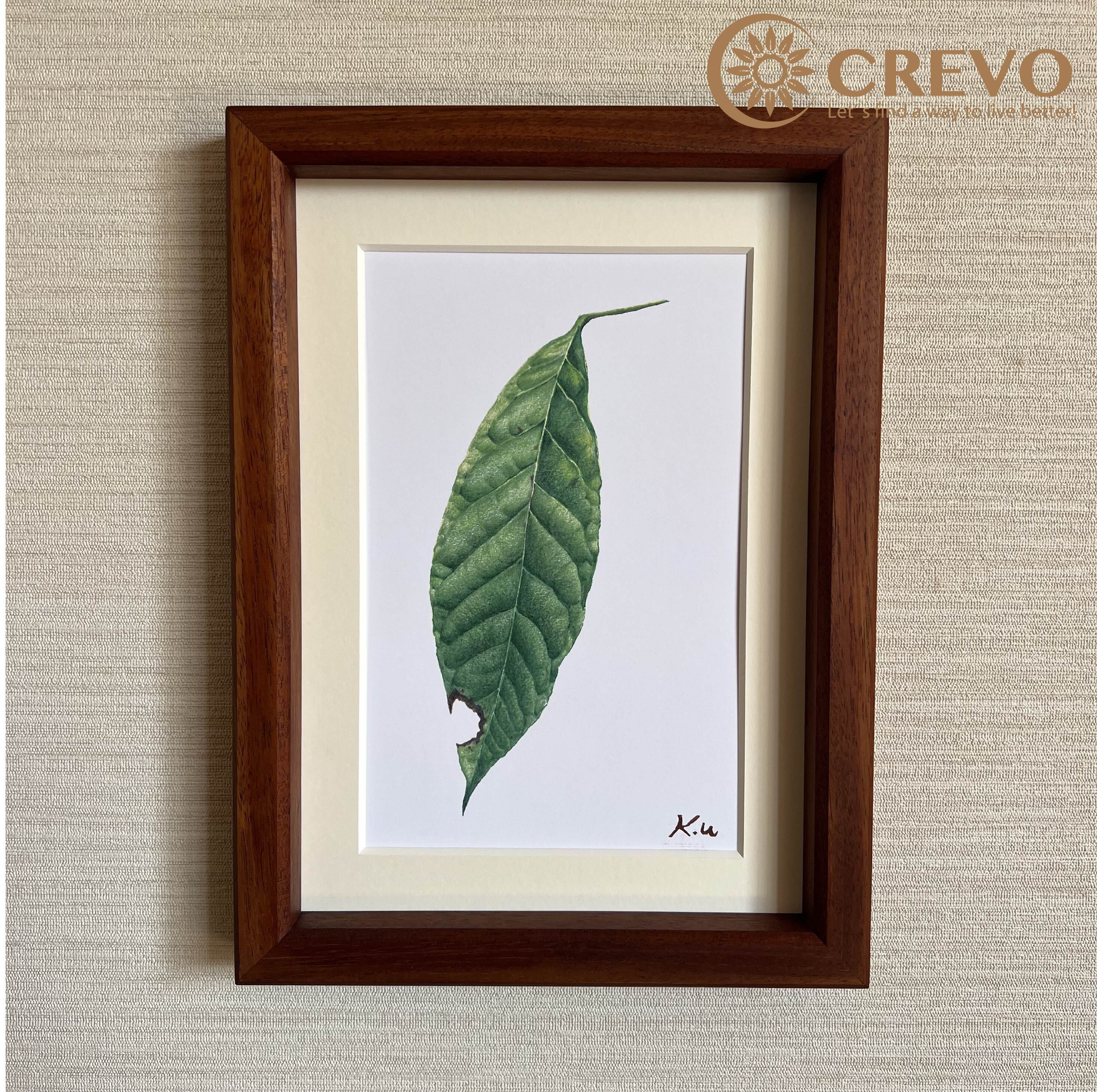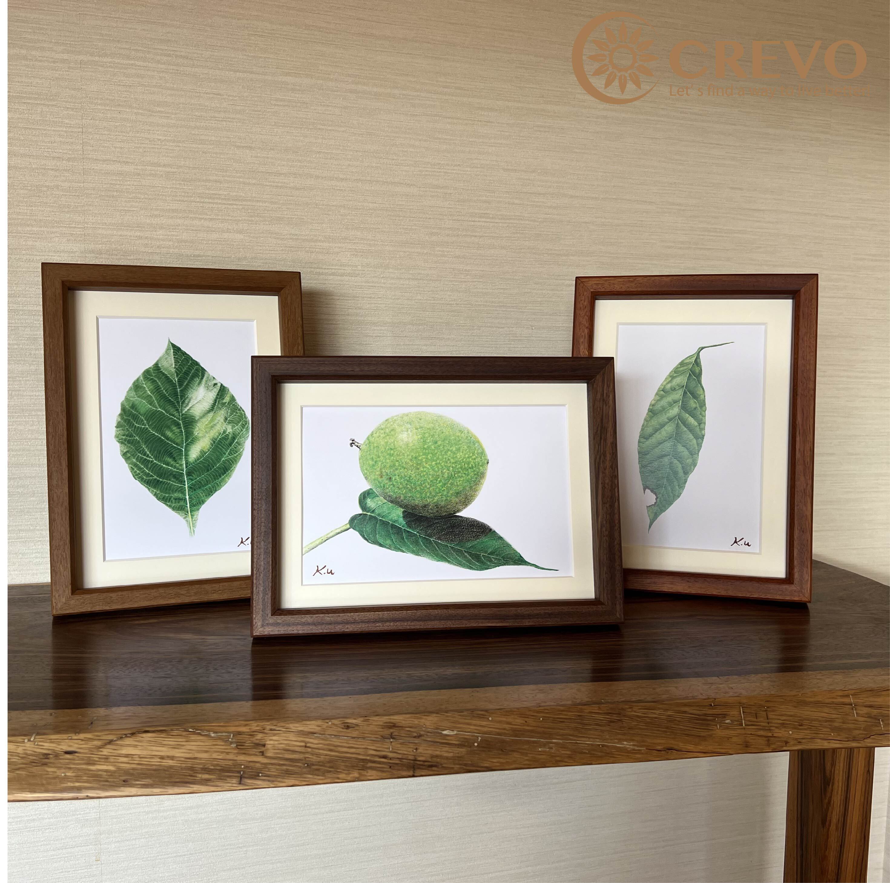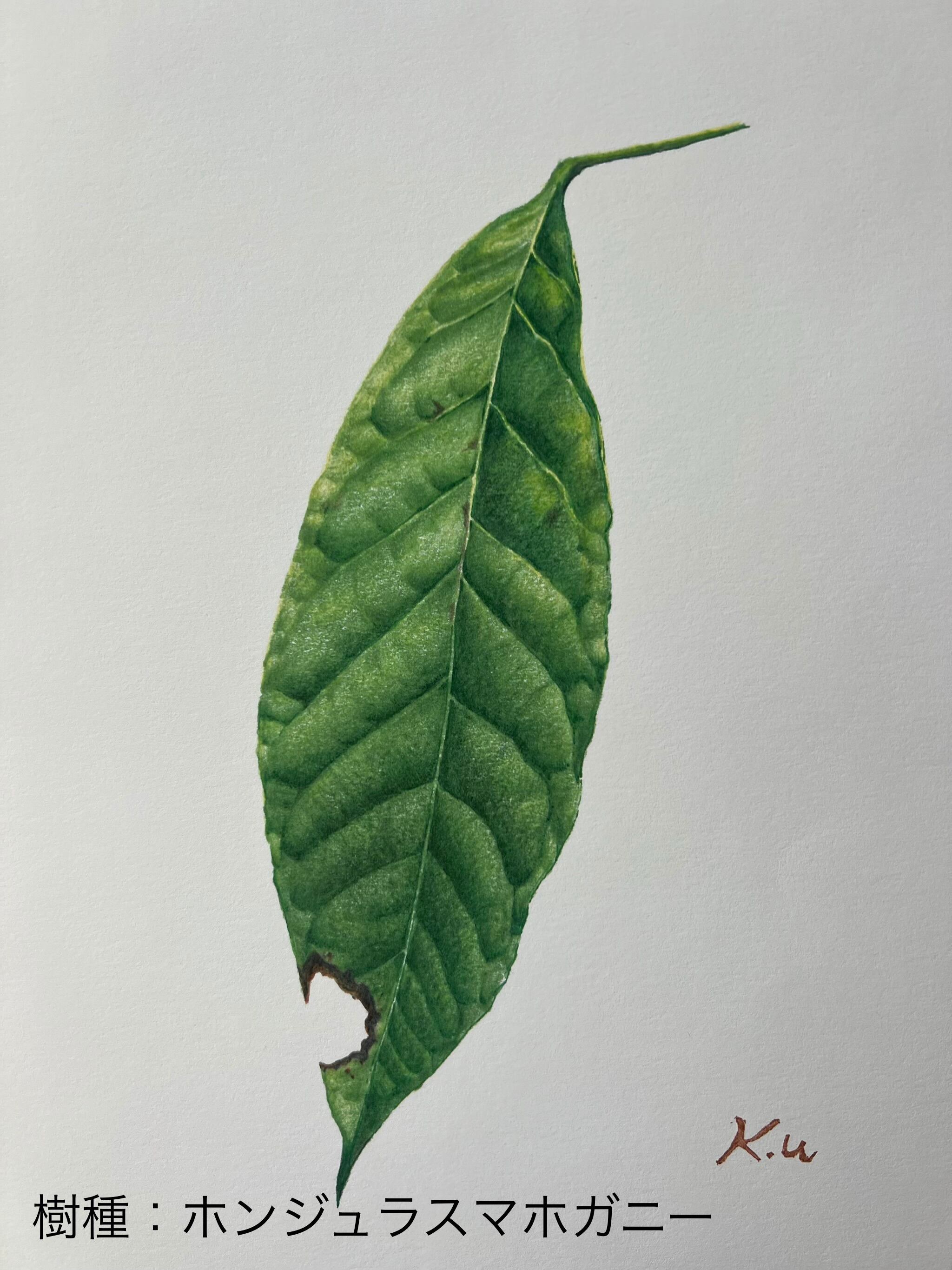 そんな木工品の中で、世界三大銘木であるウォールナット、チーク、マホガニーは特に人気の高い樹種の魅力を、色鉛筆で繊細に表現した美しい葉っぱの絵画です。
